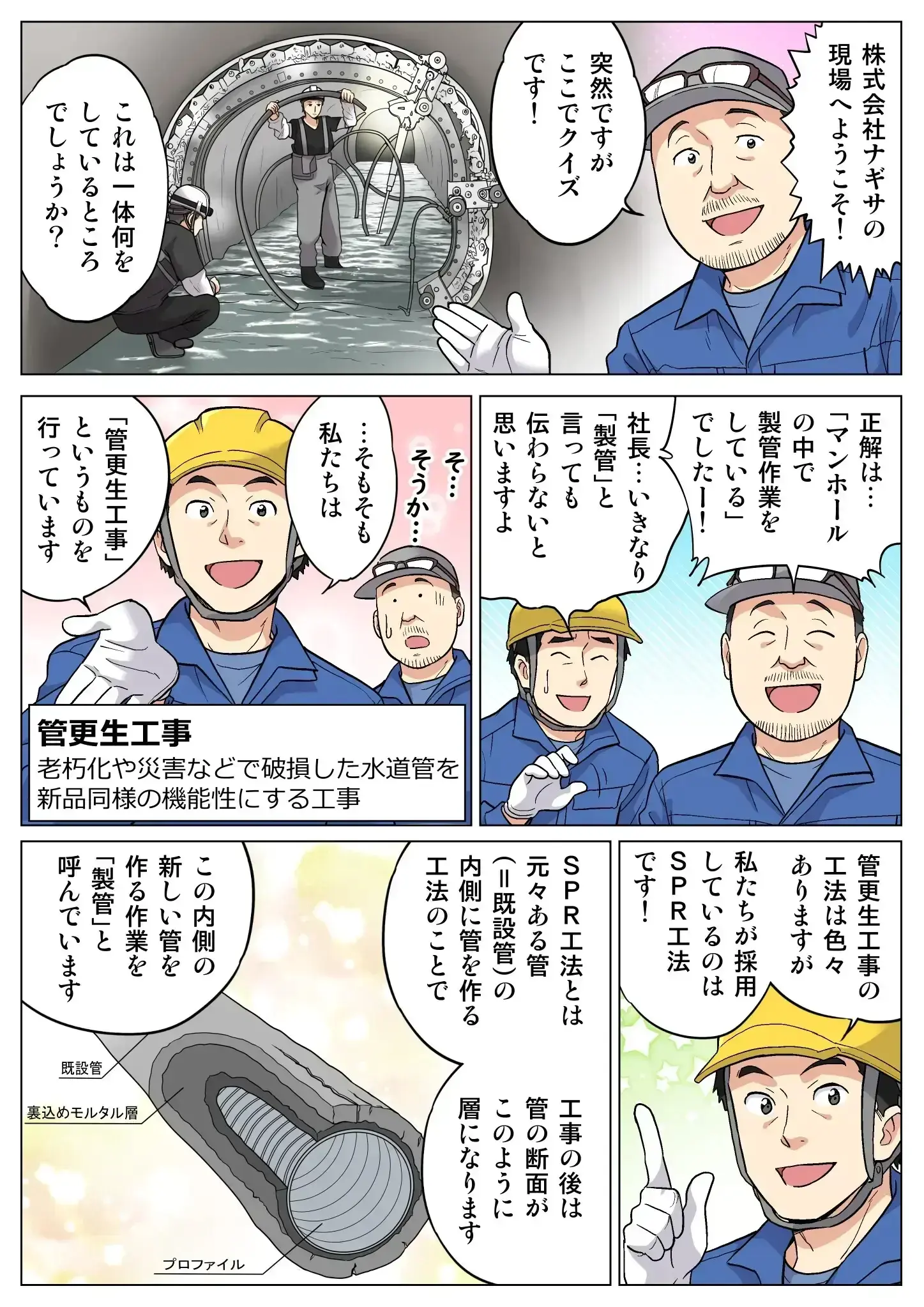 SPR工法とは、既設管を活用し新しい複合管を形成する工法です。肝となるのは「製管」作業で、水道管の寿命を延ばします。管更生工事において重要な技術です。