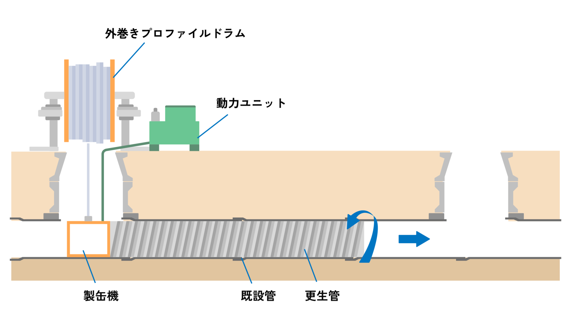 プロファイル(新管となる材料)をマンホール内に供給し、製管機のローラーを回転させることで整管します。この方法で精密に新しい管を形成します。