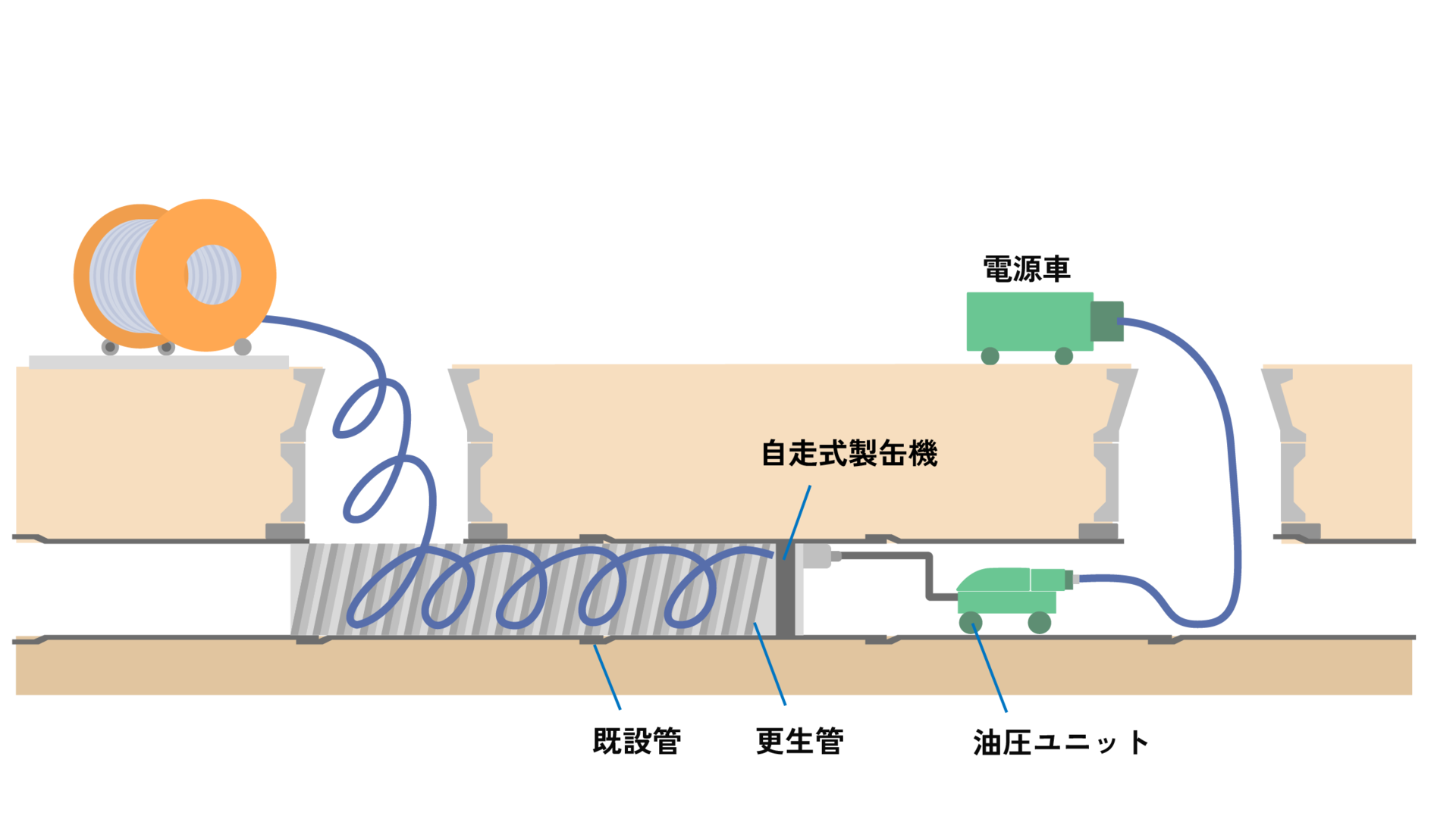 製管とは、既設管の中に新しく管を作る作業です。元押式と自走式の2つの方法があります。